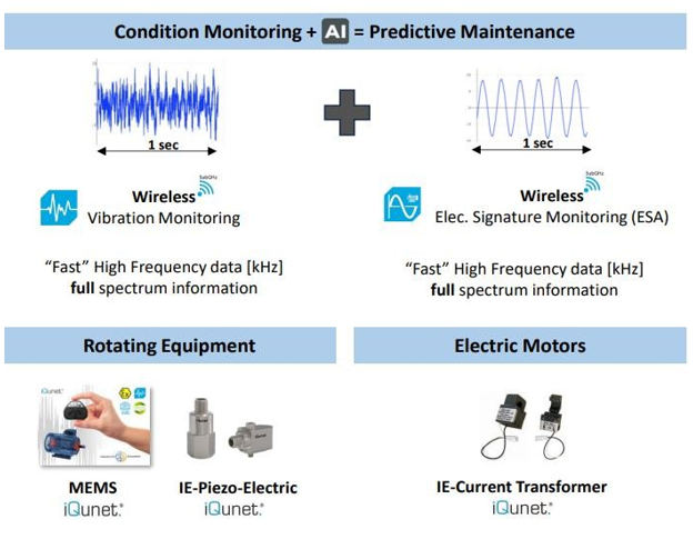 • Wireless sensors monitor vibration, temperature, and other machine indicators